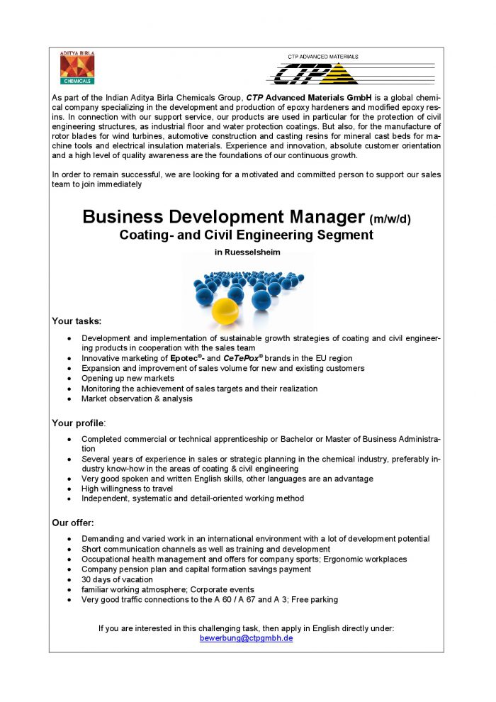 If there is no suitable job vacancy for you at the moment, we look forward to receiving your unsolicited application at bewerbung@ctpgmbh.de.