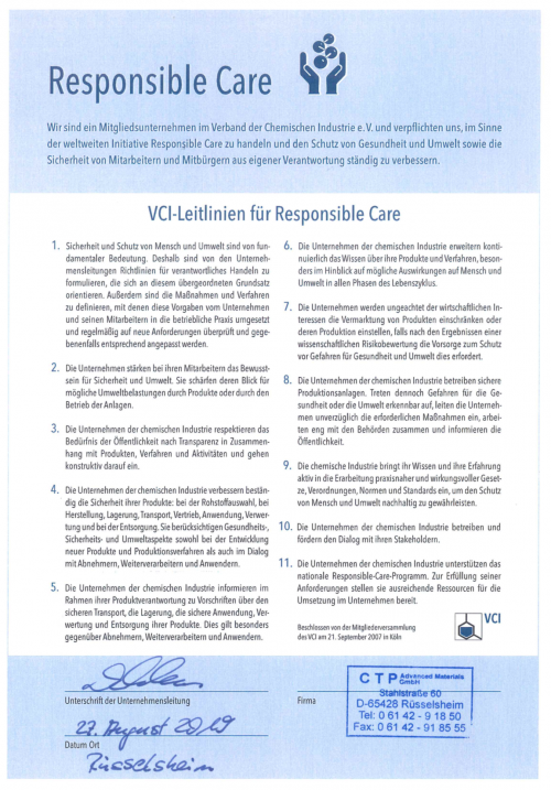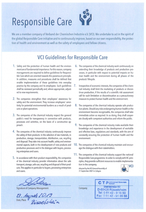 „Responsible Care“ steht bei uns für den Willen zu einer ständigen Verbesserung von Sicherheit, Gesundheits- und Umweltschutz – unabhängig von den gesetzlichen Vorgaben. Sie ist auch Verpflichtung jedes einzelnen Mitarbeiters in unserem Unternehmen, seine persönliche Kompetenz zum Nutzen von Mensch und Umwelt einzusetzen. In diesem Sinne interpretieren wir auch das Ziel der Nachhaltigkeit als permanente Herausforderung zu lernen und zu verbessern.